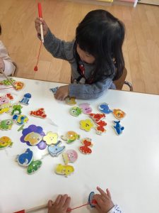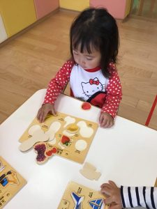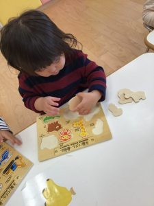 今週は雨の日が続いたため、室内遊びが多く、いちご組さんの間ではパズルが流行しました?