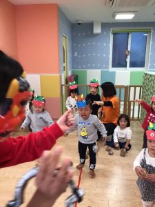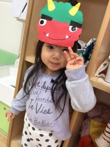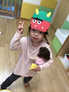 1週間ほど前から子どもたちの中でも「鬼はそと!福はうち!」と節分ごっこをして遊ぶ姿が見られました!「鬼さん来たら倒せる?」と聞くと元気よく「うん!」と力強く頷いてくれました?
