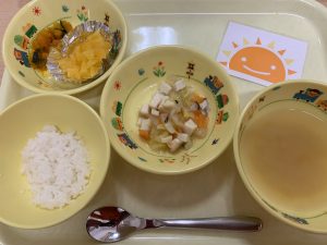 軟飯 味噌汁 生揚げの中華煮 かぼちゃの甘煮 オレンジ