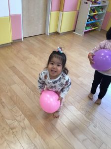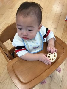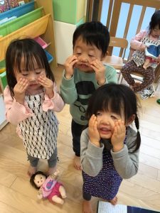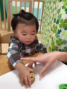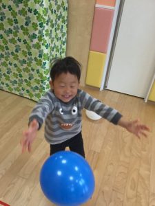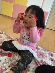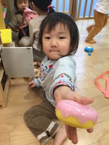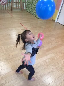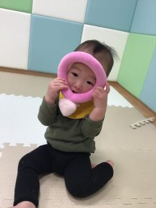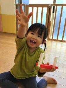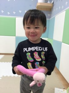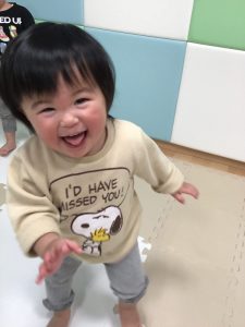 保育者に「あんぱんまん!」と好きなキャラクターの名前を話したり、音楽を聞いて体を動かしたりして元気いっぱいに日々遊んでいます♪