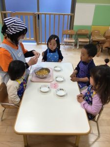 先生から、「今日は自分でお皿によそってみましょう!」とお話しがあるとみんな大喜び?