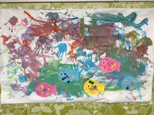 完成した作品が海のように見えたので、手を洗ったあとみんなでお魚を作って泳がせました??