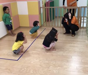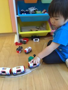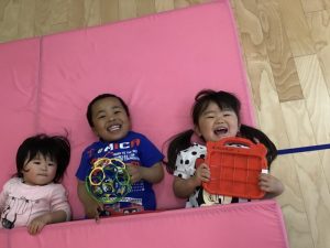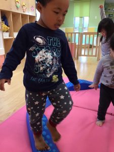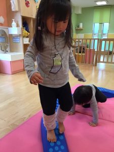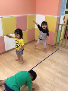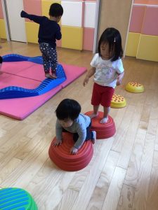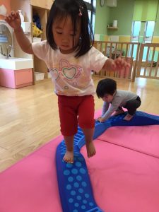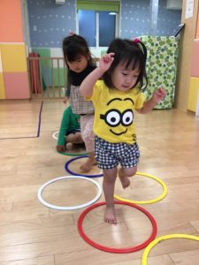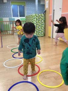フープを並べてけんけんぱと飛んで遊んだり、電車ごっこをして遊んだりなど、遊びながら普段意識しないと使わないような身体の動きを取り入れています?