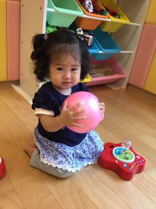 1歳児さんは先生と手を繋ぎながらゆっくりと挑戦して楽しんでいます♪