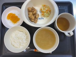 ご飯 味噌汁 鶏の照り焼き コールスローサラダ みかん缶