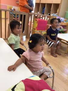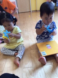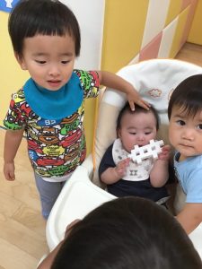 受け取った0歳児さんは、手に取り楽しそうに遊んでいますよ?