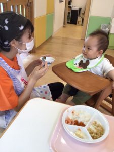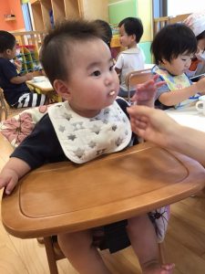 もも組さんは、寝返りをコロコロして楽しんだり、初めての保育園でのおやつやお給食を楽しく食べています?
