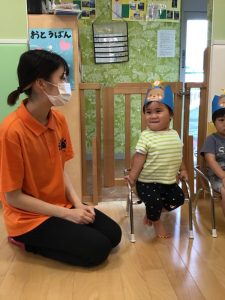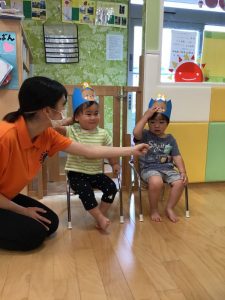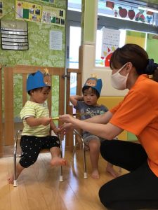 先月、新型コロナウイルスの影響により登園自粛をしていただいていた5月生まれのお友達のお誕生日会を行いました?