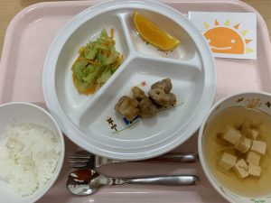 ごはん すまし汁 照り焼きチキン キャベツのソテー(カレー味) オレンジ