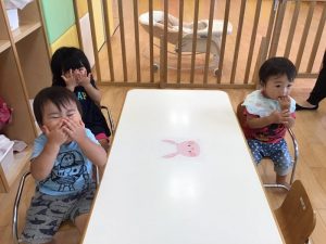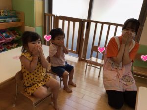 先生の真似をしてみんなも上手に口を押さえる真似することができていました?