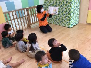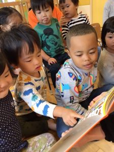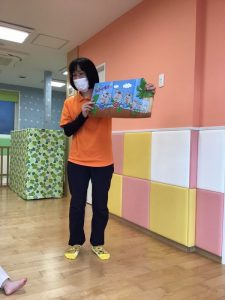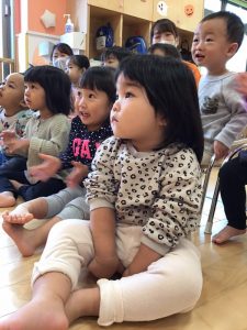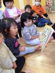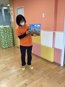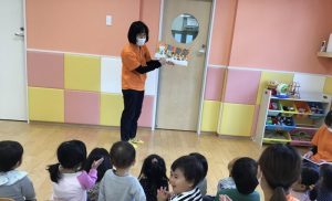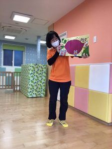 まずは、絵本「おたんじょうびおめでとう」の読み聞かせです?