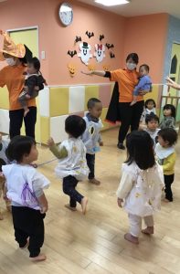 今年は、新型コロナウイルスの影響で地域を周る事は出来なかったのですが、園内でお菓子を貰ったり、踊りを踊ったりとハロウィン会?を楽しむ事が出来ました!