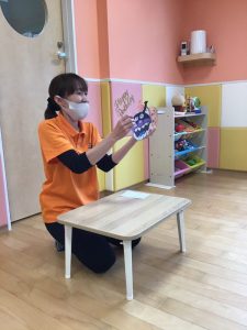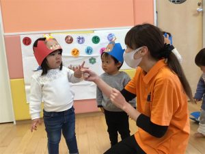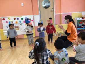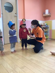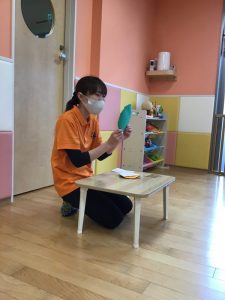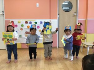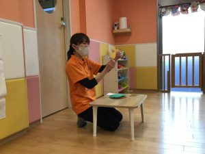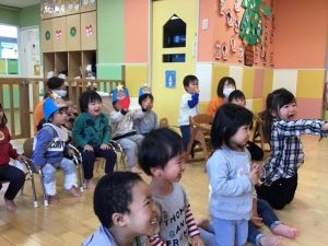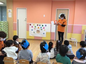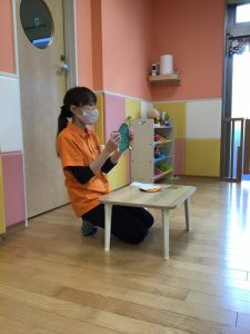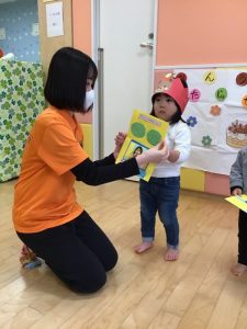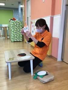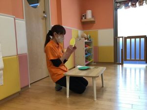 黄色や緑、白、赤など様々な丸を見せて、歌を歌いながら「これは何かな〜?」とこども達に質問します?