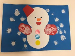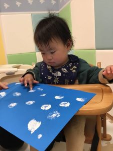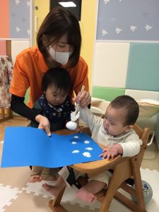 タンポに白い絵の具をつけて、ポンポン!雪❄️のスタンプをしました。