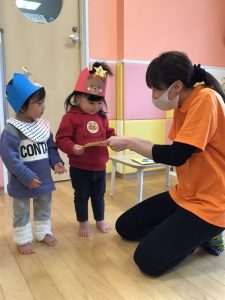 子ども達は、うさこちゃんがもらったハサミ✂️や色エンピツ、笛のプレゼントをみて