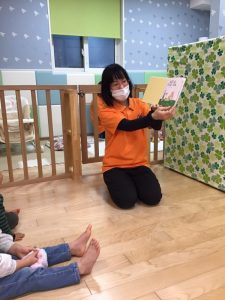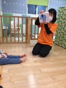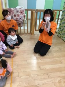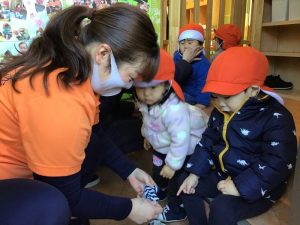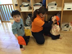 1歳児さんのお友達は、まだ靴下や靴を履くのが難しいお友達もいますが、自分でやる!の気持ちを大切にしています。