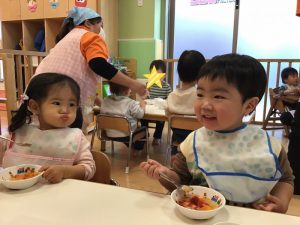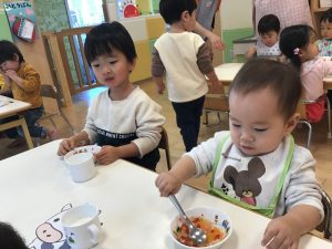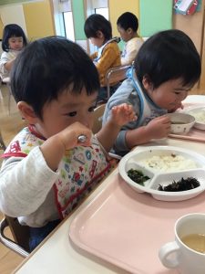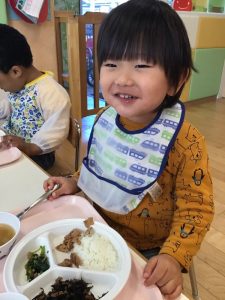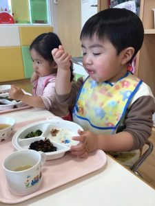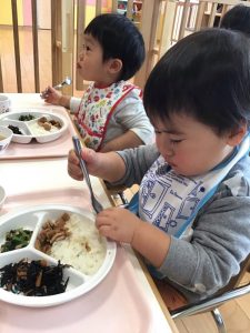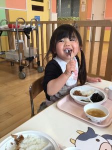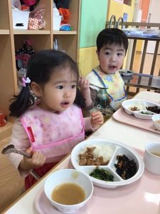 お散歩から帰って来た後は、みんなの大好きなお給食タイム??