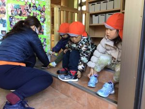 お外に早く行きたくて一生懸命履く子ども達?