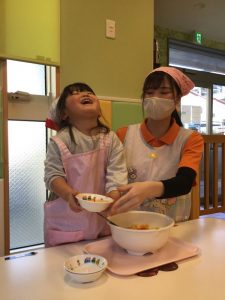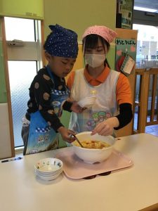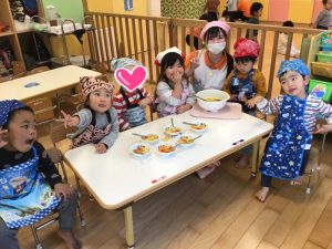 出来上がったフルーツポンチをいちご組さんやもも組さんに嬉しそうに見せていました✨