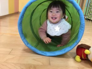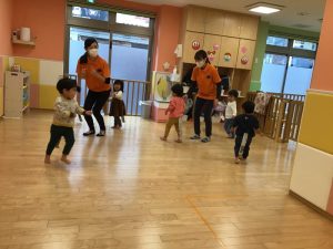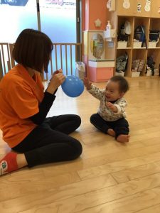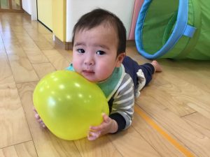 室内遊びでは風船で遊んだり、ボールを追いかけたり、たくさん動き回って遊んでいます?