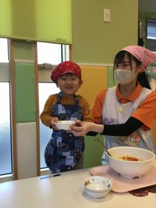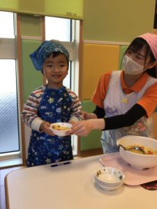 次に、おたまの持ち方やお皿に盛り付けを先生から教わります❣️
