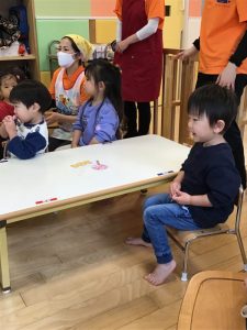 おにいちゃんのおひざに座ろうとして上手く座れなくて、「すてん!」とひざから落ちてしまうところでは「ちょこん♪」「すてん♪」と保育者の真似をして楽しそうに声に出して話していますよ✨