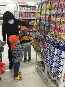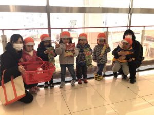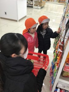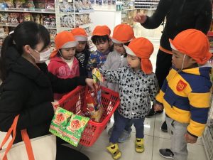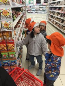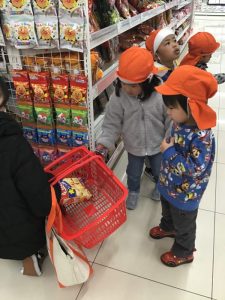 続いては、来週に卒園遠足に行くりんご組さんが遠足で食べるおやつを近所のスーパーに買いに行きましたよ?