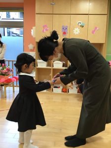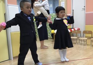 素敵なお洋服に身を包み、先生にコサージュをつけてもらうと嬉しそうな笑顔の子ども達?