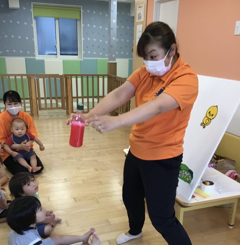 みんなで「ぐるぐる〜まぜまぜ〜?」と一緒に歌いながらフルーツジュースを作りました?✨
