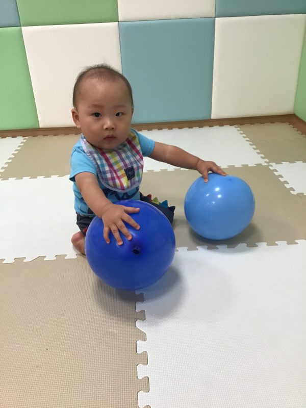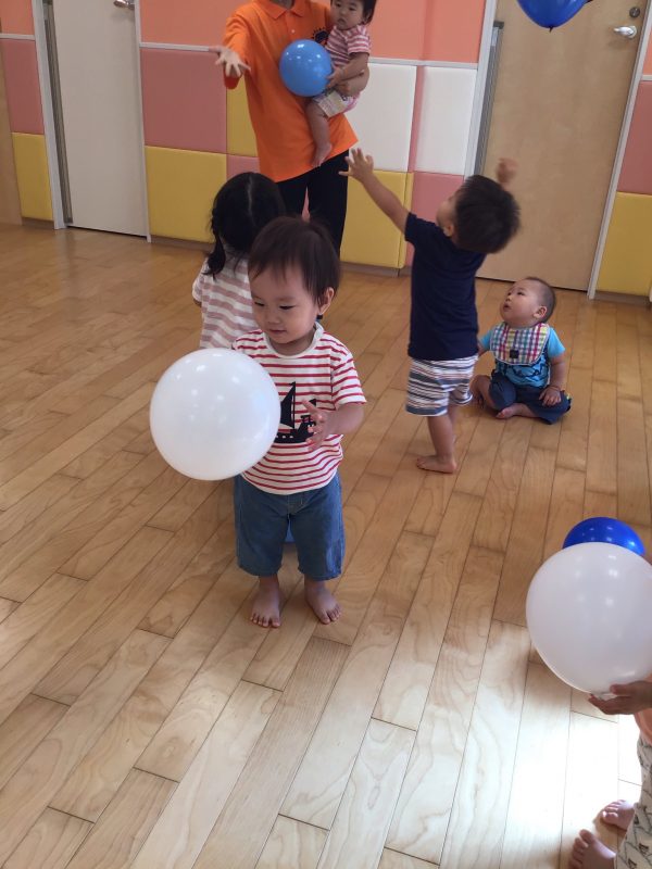 投げたり、転がしたり、先生と一緒に高く高く飛ばしたりと、汗いっぱいかきながら遊んでいました??