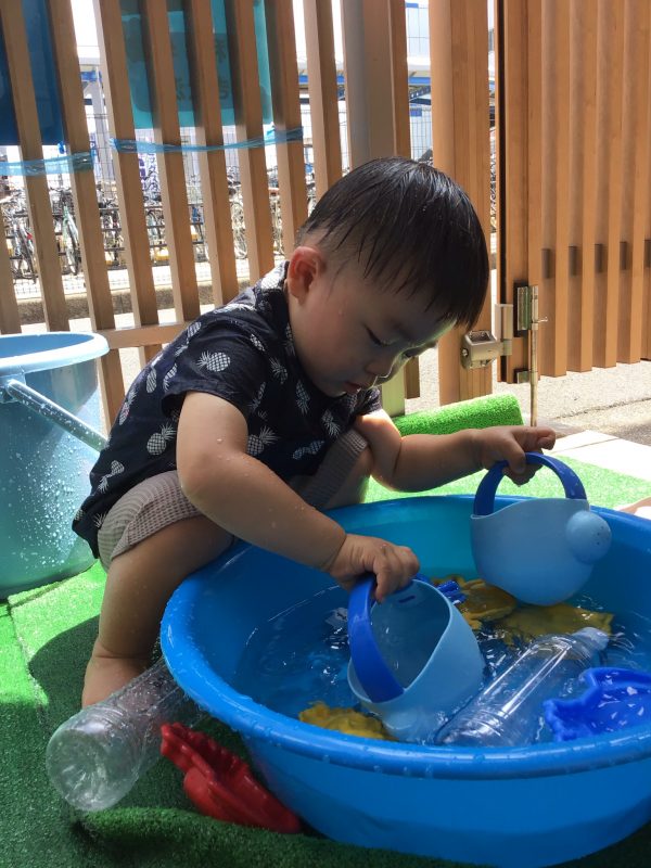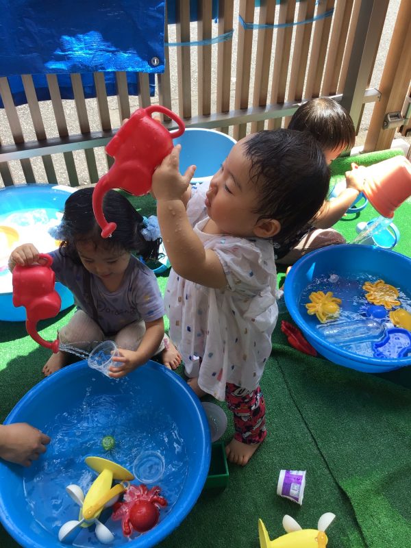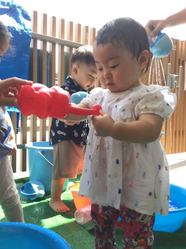 異年齢での水遊びでは、いちご組さんはりんご組さんの真似っこをして遊びが広がったり、りんご組さんはいちご組さんのお友達に優しく玩具を譲ってあげたりと、とってもいい雰囲気で遊ぶ事が出来ていました?