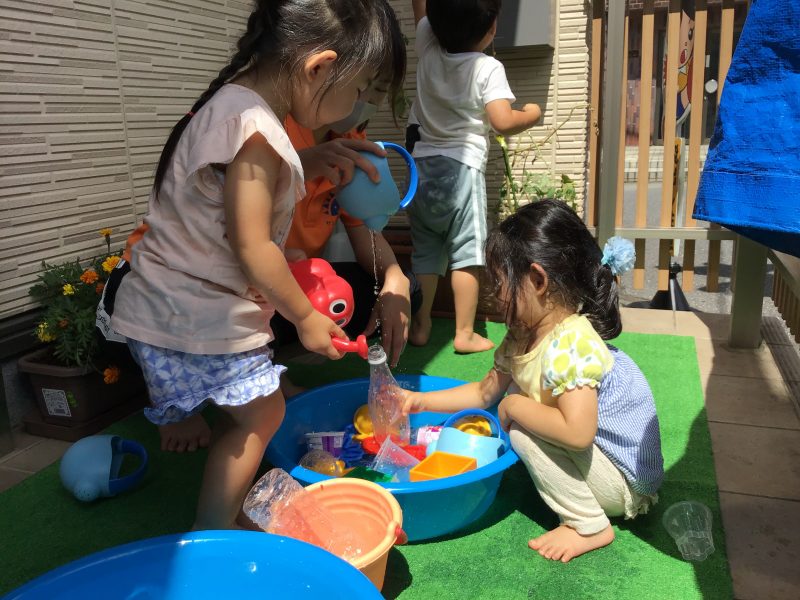 今週は体調不良でお休みするお友達や水遊びは様子見のお友達が多かったため、りんご組さん?いちご組さん?一緒になって水遊びを行いました?
