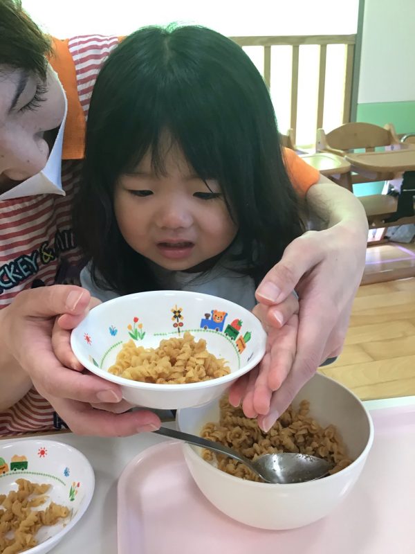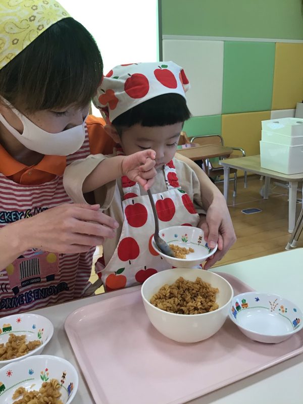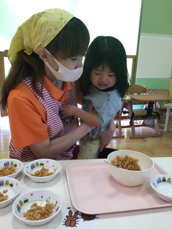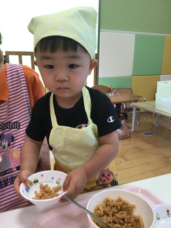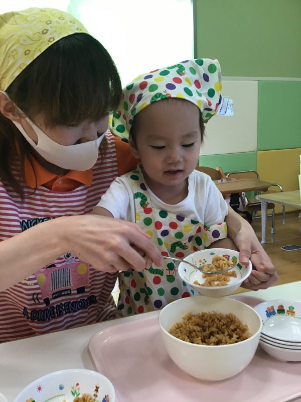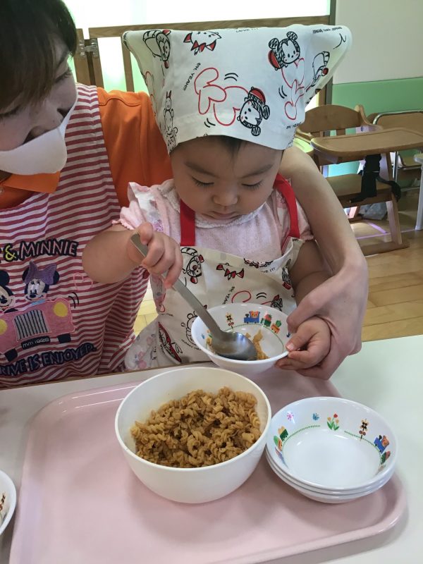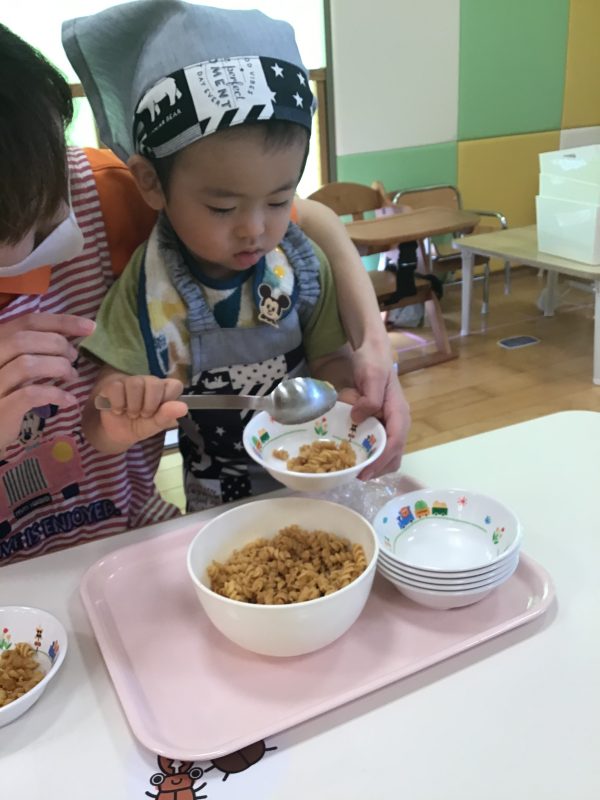 子ども達????の大好きなおやつメニュー?のうちのひとつでもある「マカロニあべかわ」の盛り付けを行いました??✨