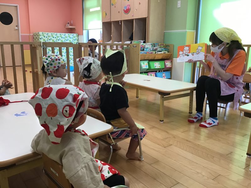 まず初めに「しろくまちゃんのほっとけーき」の絵本を先生が読んでくれました??