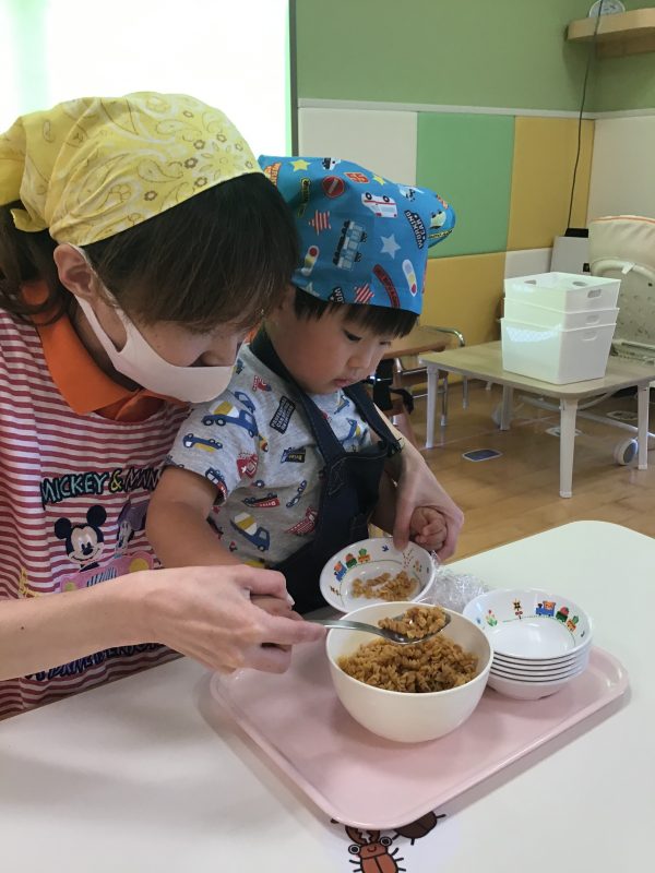 こぼさずに上手にお皿に盛り付ける姿に先生達はびっくりです??✨