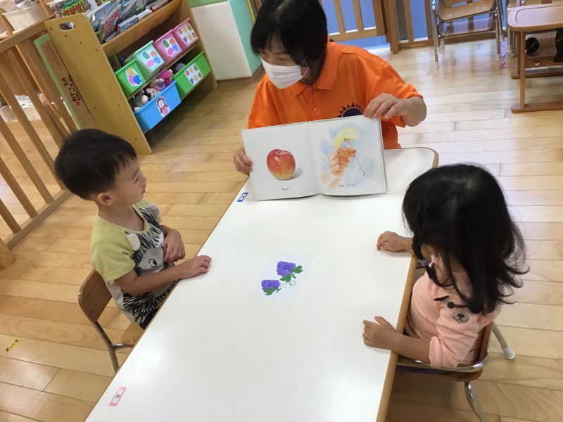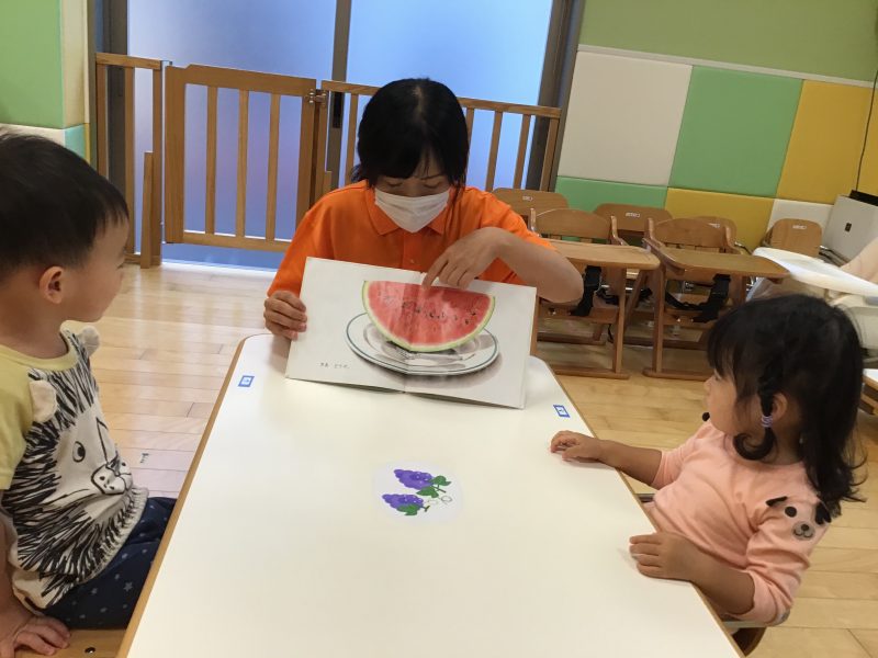 「さぁ、どうぞ?」と子ども達も果物を先生に渡し「いただきます?」「もぐもぐ?」等、やりとりをしながら楽しめる絵本になっていますので、良かったらお家でも一緒に読み聞かせながらやりとりを楽しんで下さいね?