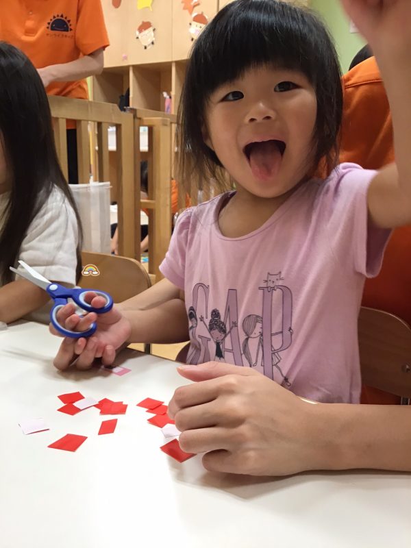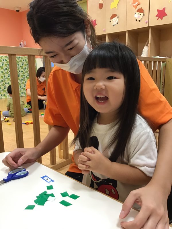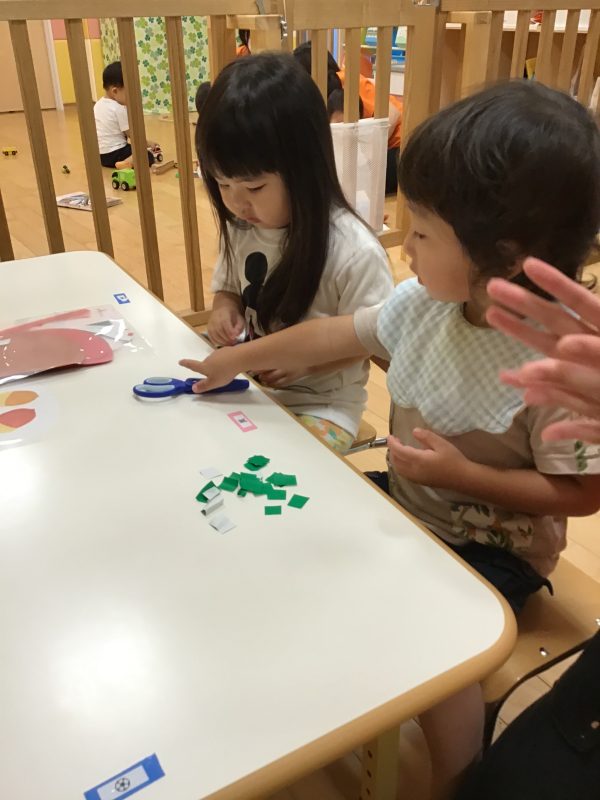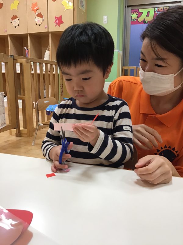 今回は、折り紙を短冊切りにしたものを用意して、子ども達がパチンと一回切りがしやすいように準備しましたよ?