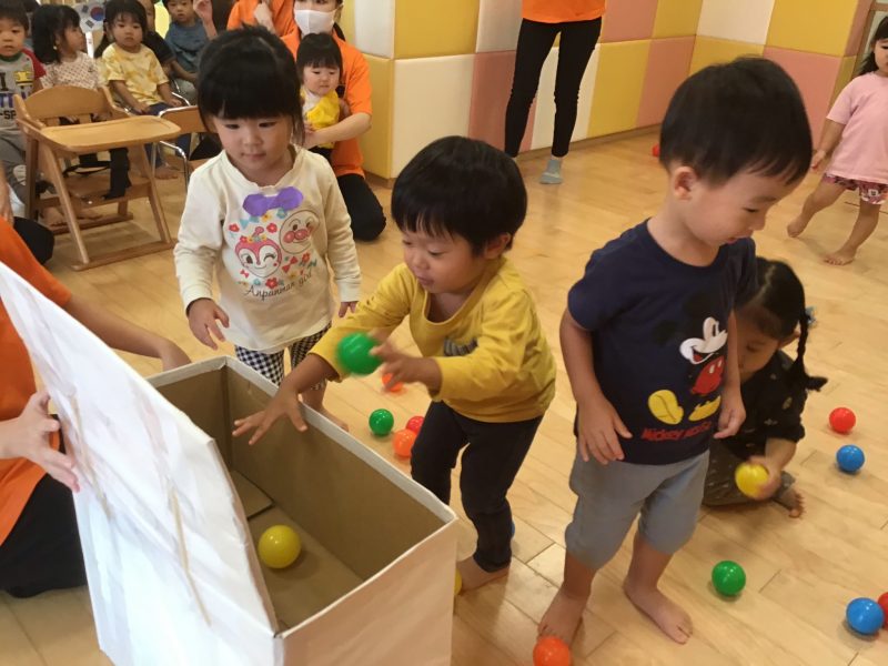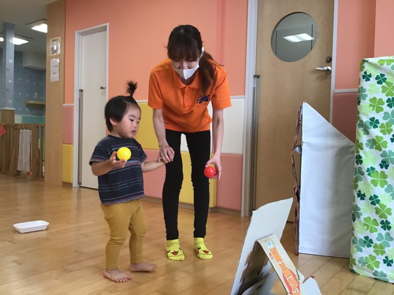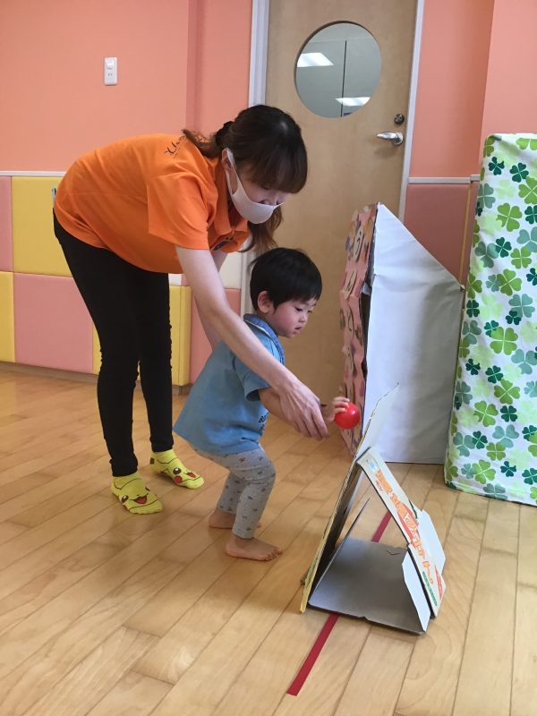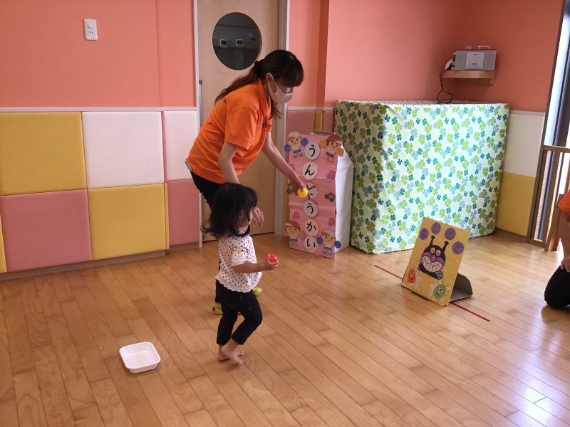この的当ては、先生と一緒にバイキンマンにボールを使って、、