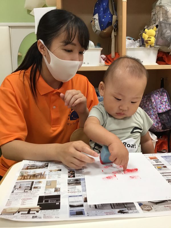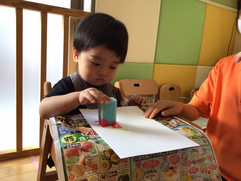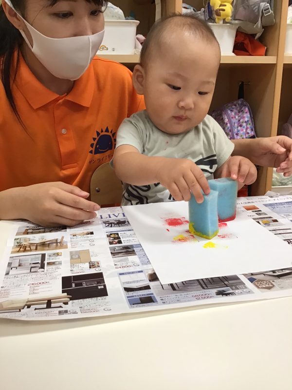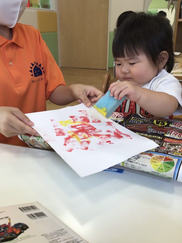 しかし、すぐに「やってみたい?」とスポンジを握り上手にスタンプしていました??