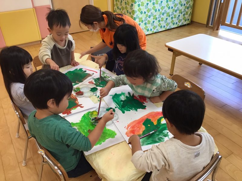 りんご組さんが?色をつけた紙は先生がチョキチョキ…✂️