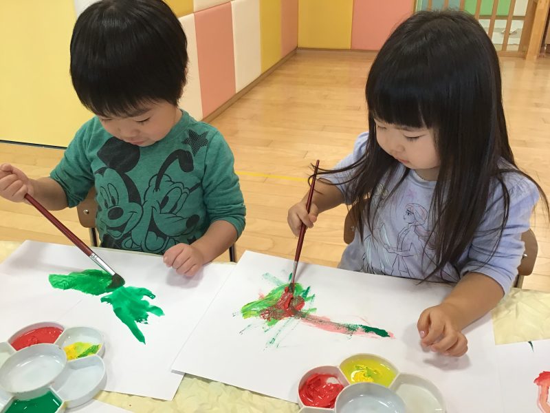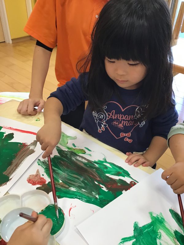 先生のお話を聞き、お手本を見た後は思い思いに画用紙に色を塗る?りんご組さん?