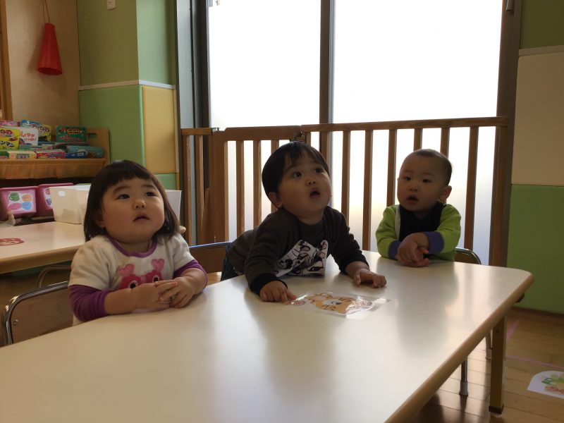 りんご組さんの楽しそうな声を聞き、「何しているの❓」ともも組さんのお友達も見に来ましたよ?