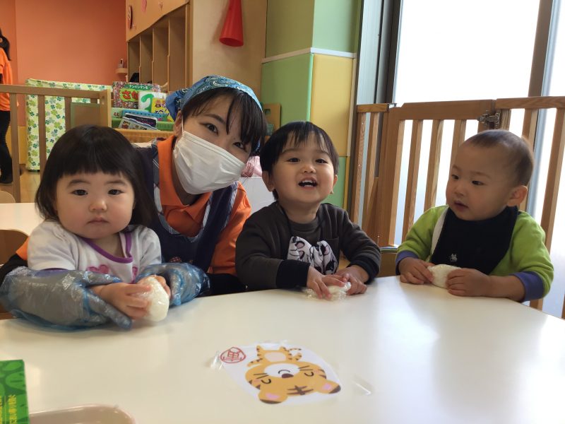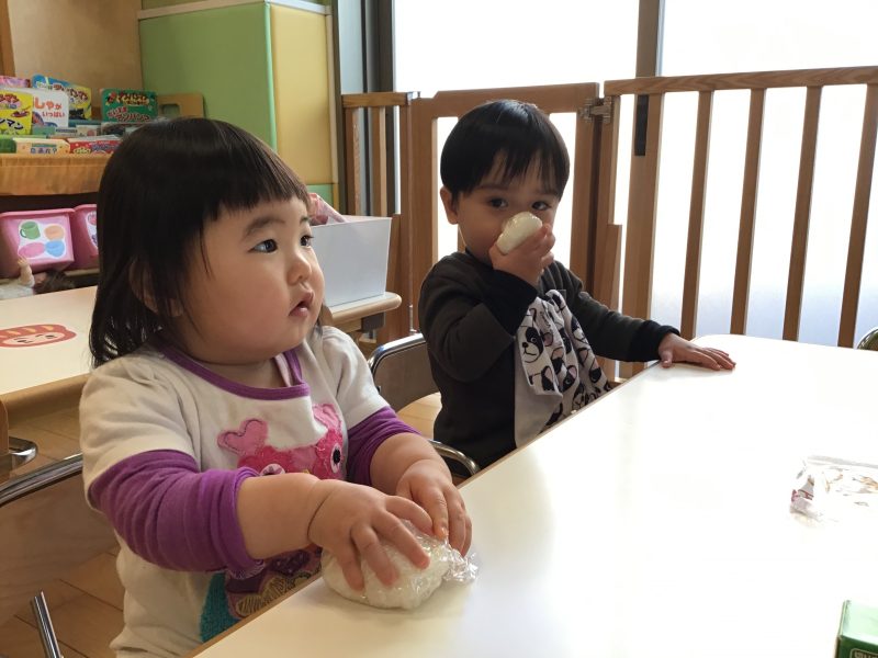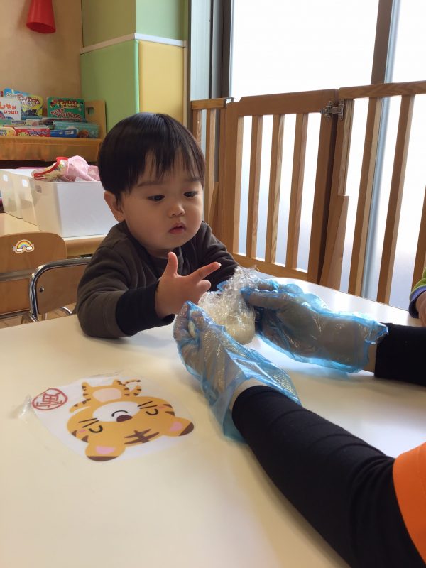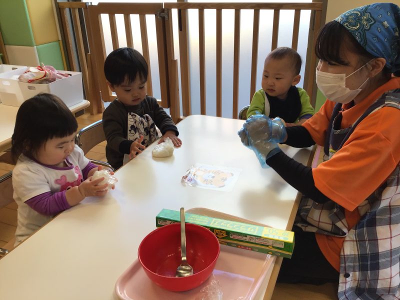 これまで野菜?に触れたり、おやつの盛り付け?を行なってきたもも組さんですが、この日はおにぎり作り?に挑戦しました✊?
