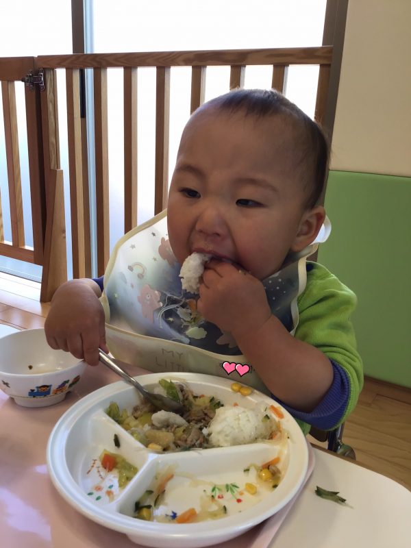「あーん?」とお口を開けたり、「モグモグ」と言って食べる真似をしたりするとっても可愛らしい姿に先生達はメロメロです??