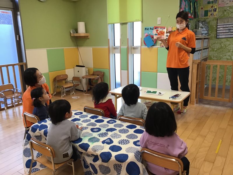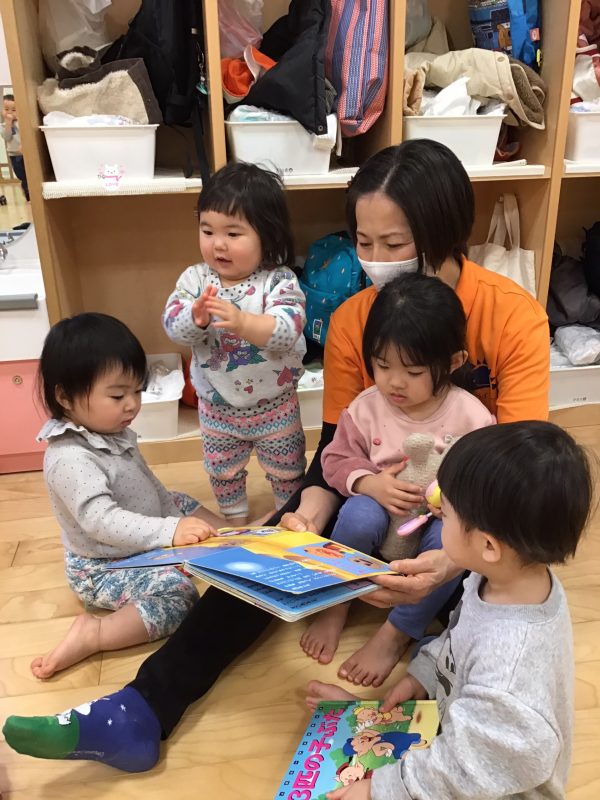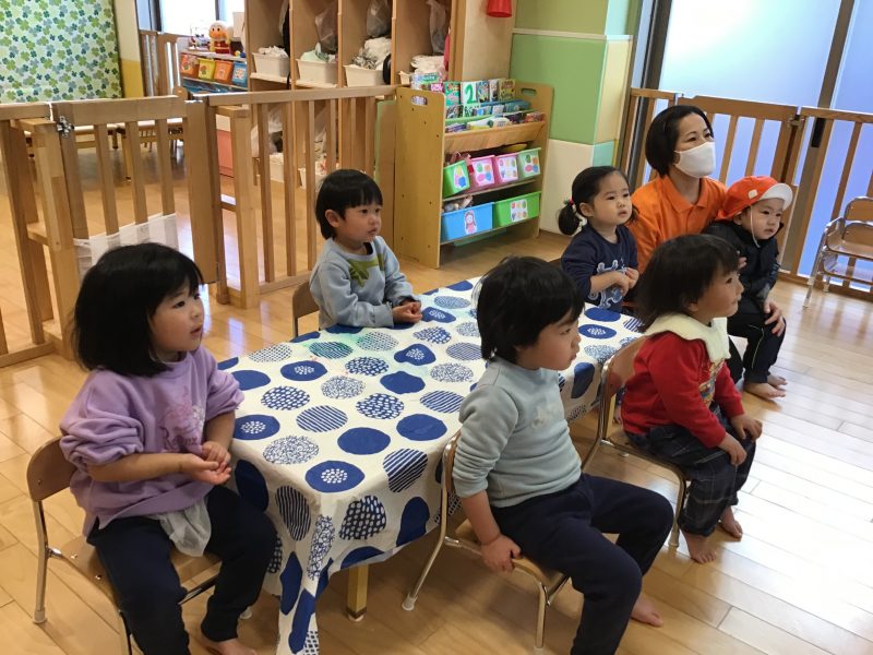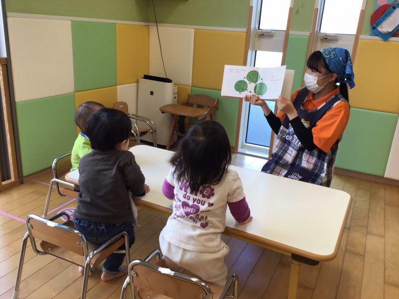 この日は、りんご組さんみんなで「おにのパンツ」の絵本を読みましたよ?