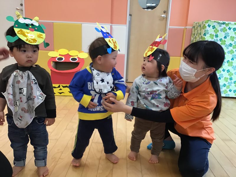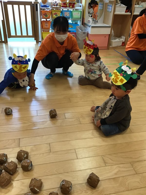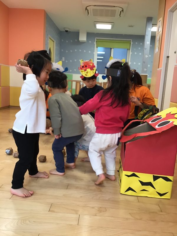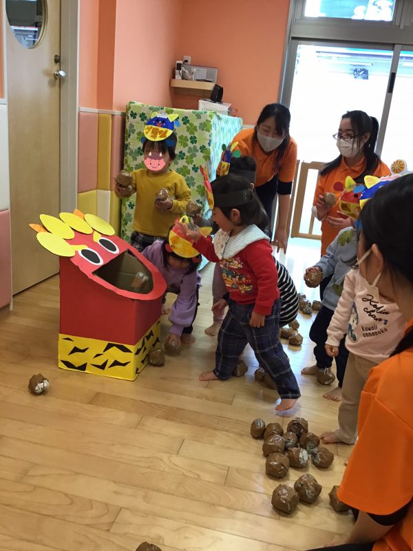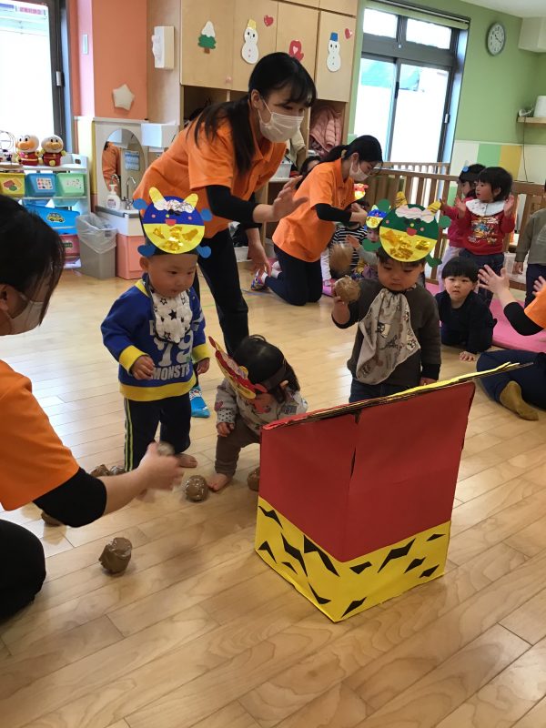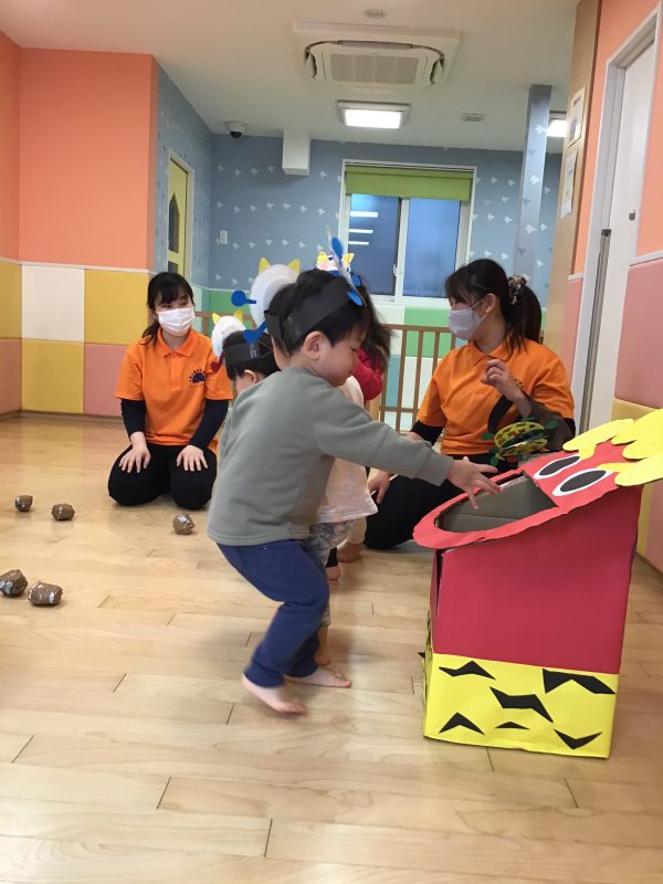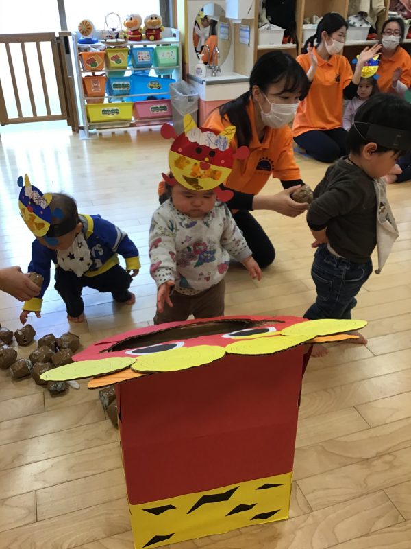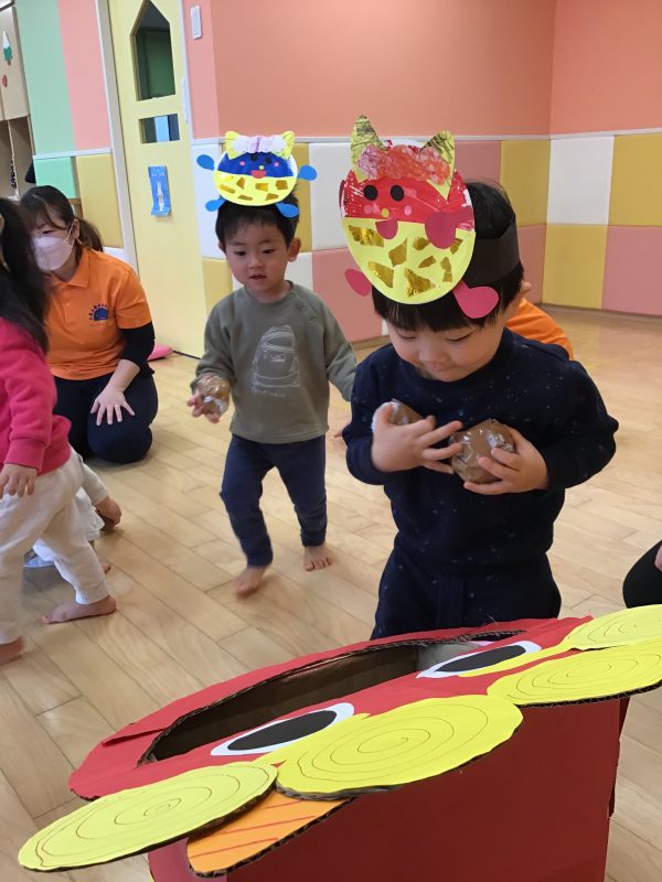 鬼をみて少しびっくりしていた子もいましたが、保育者と一緒に投げていると次第に1人でも力強く豆まきに参加することができました?✨