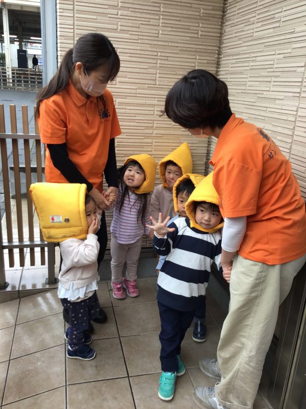 防災頭巾を被り、?‍?「口に手を当てて煙を吸わないようにね」の呼びかけにもしっかり守ってくれていましたよ☺️訓練日、雨が降っていたので園の外には出ずこの日はエントランスにて終了となりました。