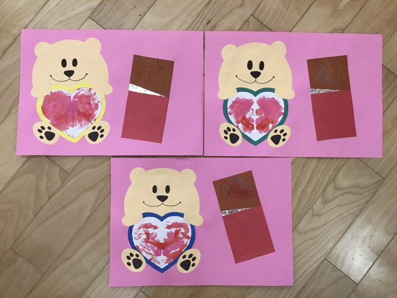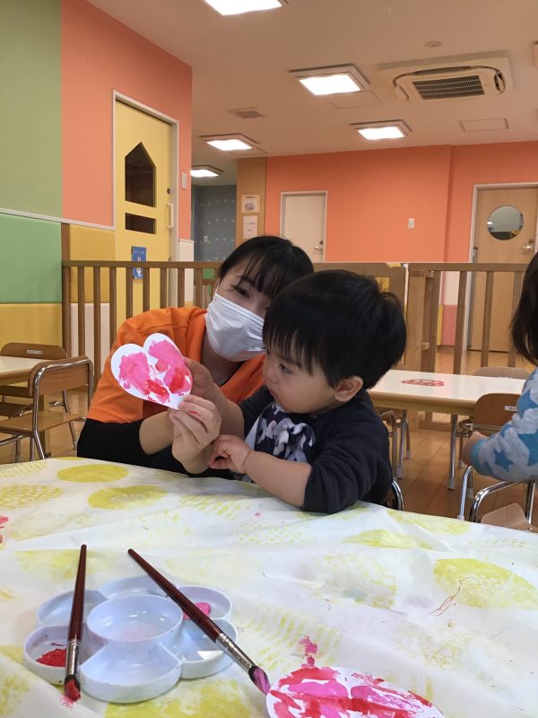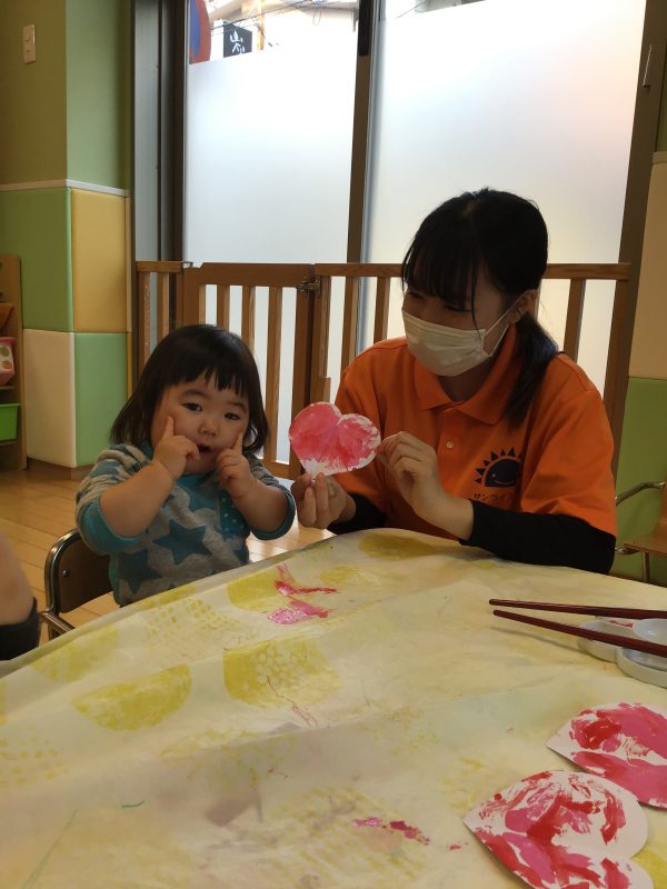2月はバレンタインデーがあるということで、もも組さんはデカルコマニーという技法を使ってハートに色を塗りましたよ?