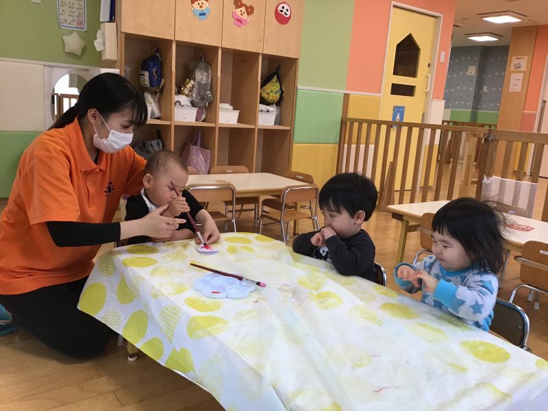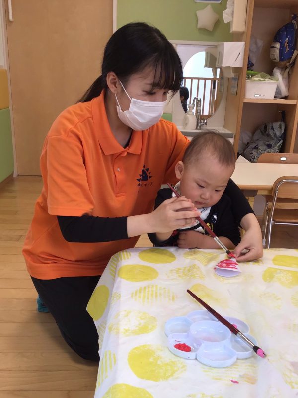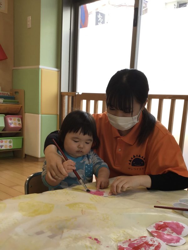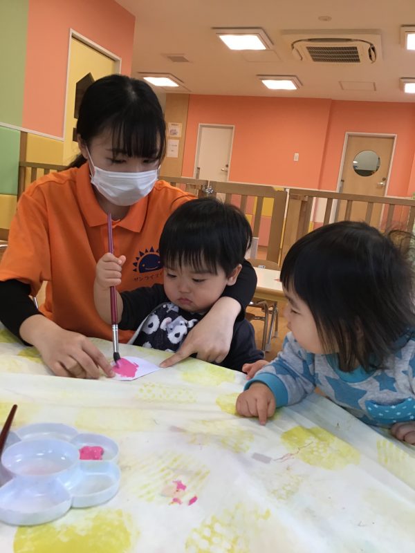 先生と一緒に筆を持って絵の具をぬりぬり?