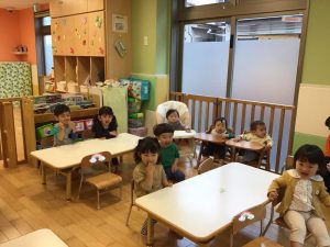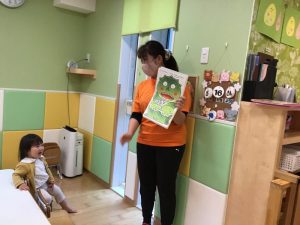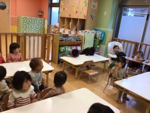 今日は、朝おやつの時間に絵本の読み聞かせをしましたのでそちらの様子をご紹介します?